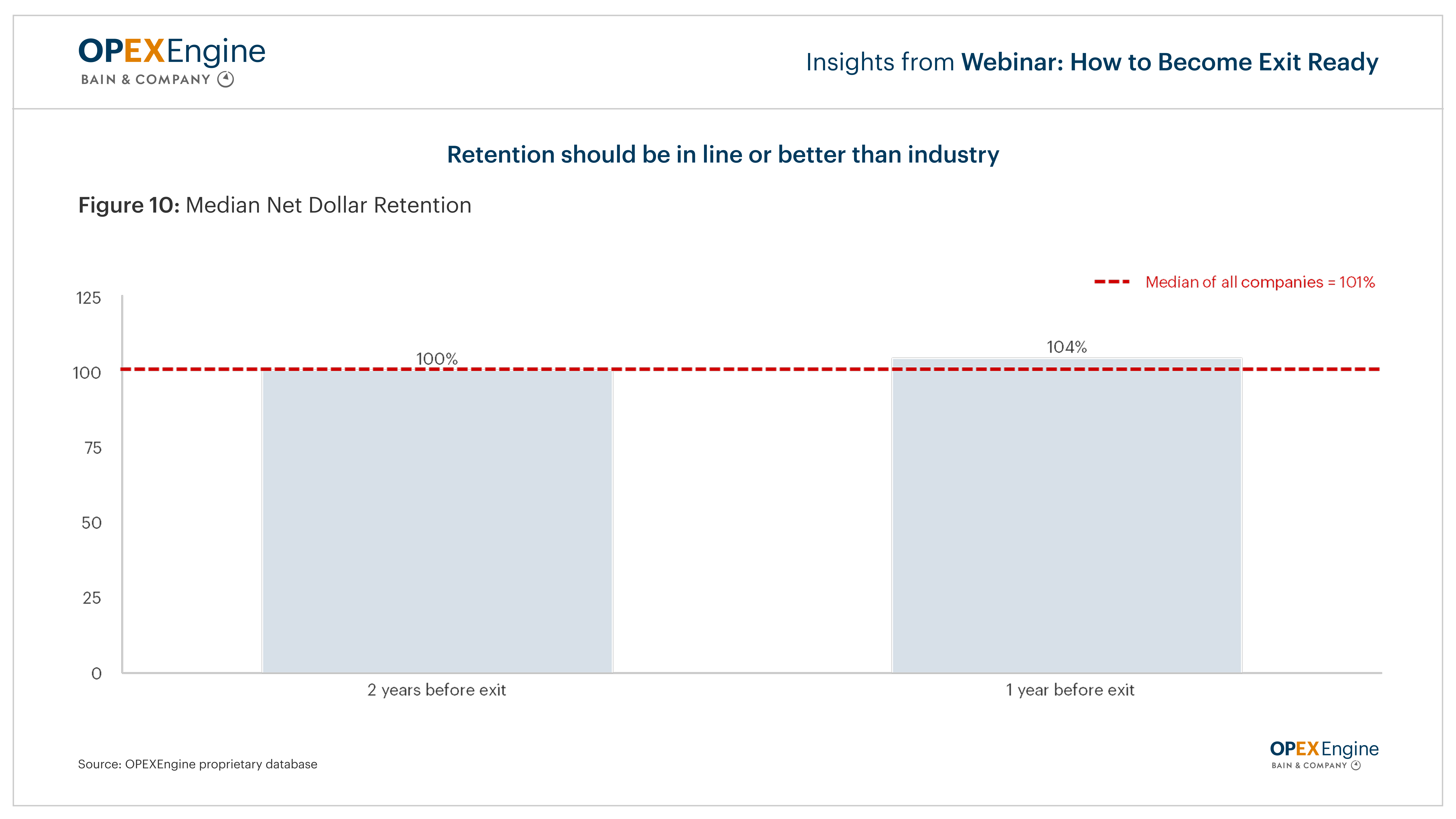 ARR growth and profitability matter, but customer retention is the ultimate test of SaaS durability. OPEXEngine’s analysis of a cohort of SaaS companies in the 1-2 years before a strategic exit shows a consistent trend: buyers prize Net Dollar Retention (NDR) above 100% as proof of customer stickiness and expansion.